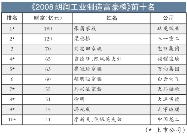 胡潤昨天首次發布《2008胡潤工業制造富豪榜》,據2008年9月1日市值計算,玖龍紙業的張茵家族以財富180億元排名第一(但根據11月12日股價,張茵家族財富縮水至74億元,梁穩根取代張茵排名第一)。