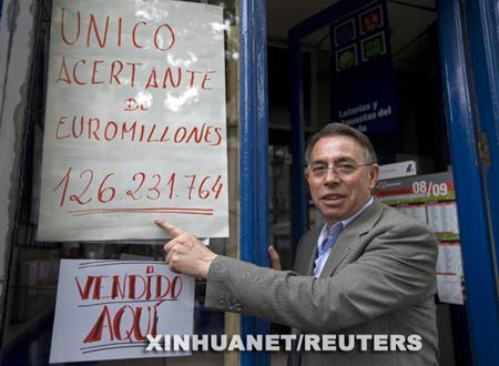 位于西班牙首都馬德里自由女神廣場的“黑貓”彩票銷售店的櫥窗上,貼著一張標示,告訴路人“歐洲百萬”頭獎在這兒售出。