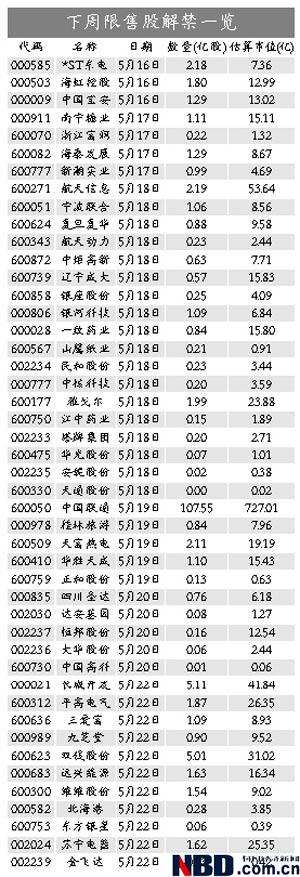 市場人士認為,下周限售股解禁壓力集中在中小板的 “大小限”和有增發限售股解禁上市的這類公司上,而股改限售股的壓力較小。
