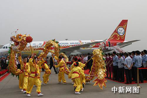 中新網(wǎng)成都6月23日電(楊杰 陳典路)23日下午17點09分,國內(nèi)總裝的第一架空客A320飛機(jī)、“中華龍”號調(diào)機(jī)航班抵達(dá)成都雙流機(jī)場,飛機(jī)緩緩滑向停機(jī)位,兩輛噴水車為飛機(jī)“噴水洗塵”;機(jī)坪上鑼鼓聲聲,獅舞龍騰。至此,國內(nèi)總裝的第一架空客A320飛機(jī)正式落戶四川航空。