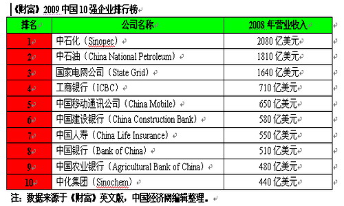 美國《財富》雜志英文版10月13日公布了中國10強公司排行榜,中石化以2080億美元銷售收入(2008年數據)名列第一位,中石油排名第二,2008年銷售收入為1810億美元。排在第三位的是國家電網公司,2008年營業收入為1640億美元。