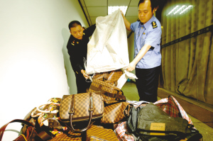 “都有些什么東西?”“隨便看嘛,皮包、皮帶,全是名牌喲……”1日晚7點多,設在渝中區某高檔寫字樓的一“專賣店”迎來了兩名特殊客人。“專賣店”門口擺著近3平方米的大招牌,寫著“LV重慶店”等內容。兩名客人進店后不到一分鐘,突然涌進10余名身著工商制服的執法人員。