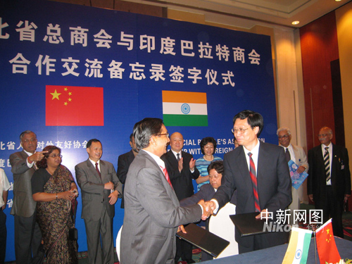 中新網(wǎng)武漢7月24日電 (艾啟平 劉俞君)湖北—印度經(jīng)貿(mào)合作洽談會(huì)24日在武漢舉行。洽談會(huì)上,湖北省總商會(huì)與印度巴拉特商會(huì)簽署了合作交流《備忘錄》,期望搭建起湖北與印度企業(yè)界交流合作平臺(tái)。