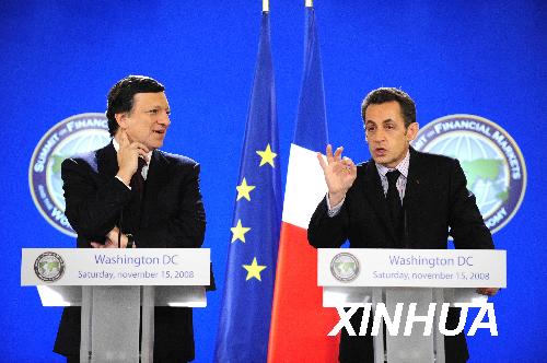 11月15日,在美國首都華盛頓出席二十國集團領導人金融市場和世界經濟峰會的法國總統薩科齊(右)和歐盟委員會主席巴羅佐聯合舉行新聞發布會。 新華社記者張巖攝
