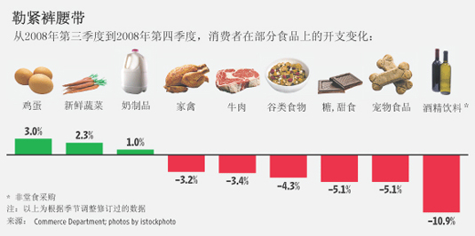 美國消費(fèi)者已經(jīng)大幅削減了食品開銷;他們正避免出外就餐,選擇普通廉價(jià)產(chǎn)品,喝自家煮的咖啡,購物時(shí)找便宜貨。在這種消費(fèi)勢(shì)頭的沖擊下,許多食品加工商、雜貨連鎖店和餐館的生意和利潤都出現(xiàn)了下滑。