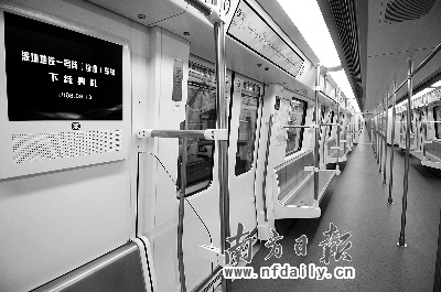 記者發現,車廂比廣州3號線地鐵要寬敞。據介紹,廣州3號線地鐵車輛是B型車,寬度只有2.8米,又是直線型車體。相比之下,深圳地鐵一號線(續建)車輛車體寬達3.1米,且采用鼓形車體,視覺效果也要寬敞許多,據悉,最大載客量可達2502人。