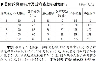 最低的個人繳費標(biāo)準(zhǔn)確定為30元,以20元為級差,向上設(shè)立五個檔次的繳費標(biāo)準(zhǔn),最高一檔為110元。參保農(nóng)民可根據(jù)各自的經(jīng)濟(jì)承受能力自愿選擇一檔繳費,多繳多得。《辦法》對經(jīng)濟(jì)組織設(shè)計了5個檔次的繳費標(biāo)準(zhǔn),從10元至50元不等;對于確無經(jīng)濟(jì)能力的經(jīng)濟(jì)組織,也可以暫不為參保人繳費。