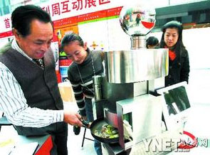 展臺上,一臺廚房機器人特別吸引參觀者的注意,機器人看上去像是一摞鐵籠屜,背后有各種作料罐,胸前連接著鍵盤和顯示器。機器人的發明者向記者演示了一下操作流程,只要放入原材料,點擊電腦中的菜單,機器人就會自動定時翻炒,幾分鐘一盤熱菜就出鍋了。“目前我已經開發了200個菜單,宮保雞丁、魚香肉絲這樣的家常菜,機器人都能炒,而且味道還能跟大廚較量。”