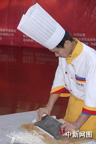 除了較量廚技,長春各酒店的廚師們還帶來了精彩的廚藝絕活表演,鞏玉輝師傅的剪刀面、讓現場觀眾領教了什么是“面板上的舞蹈”,而曹清春師傅的現場食品雕刻,則帶來了一場視覺盛宴。