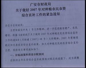 鄧永學(xué)說的每畝補(bǔ)貼25元,指的是2006年的種糧補(bǔ)貼標(biāo)準(zhǔn),根據(jù)記者了解,在武勝縣,2006年對(duì)于農(nóng)戶種植一畝糧食直補(bǔ)和綜合補(bǔ)貼總計(jì)25.12元,而在2007年,每畝補(bǔ)貼提高到了51.05元,國家的種糧補(bǔ)貼額度提高了一倍,然而,在當(dāng)?shù)兀瑖覍?duì)種糧補(bǔ)貼的提高速度趕不上生產(chǎn)成本的漲價(jià)速度。