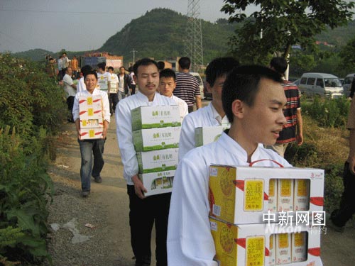 結(jié)合實際情況,從伊利邛崍工廠劉志亮帶來的救援人員和綿陽云永剛組織的人員 20人,加上一些在當?shù)氐闹驹刚撸医M織了幾十個人隊伍,決定把牛奶靠人力搬進去,搬去體育場,并發(fā)給災民。晚上看他們拍的照片,發(fā)現(xiàn)真是一支浩浩蕩蕩的搬牛奶的隊伍。