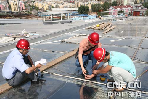 中鐵建工集團技術人員正在對北京南站太陽能光伏電池板進行單體測試