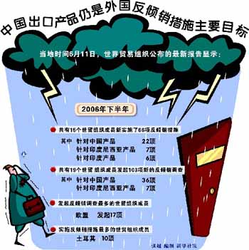 世貿(mào)組織早前發(fā)布的反傾銷統(tǒng)計報告顯示,從1995年至2006年,中國已連續(xù)12年成為世界上遭受反傾銷調查和被實施反傾銷措施數(shù)量最多的國家,2007年全球新立案的反傾銷調查雖呈下降趨勢,但中國仍然是全球反傾銷調查的頭號目標國。