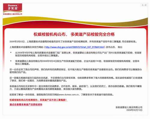 1、在多美滋中國官方網站上發布了正式聲明,聲明多美滋在國內生產銷售的奶粉全部符合中國相關標準。所有批次的產品都經過官方認證的實驗室的檢驗,被確認不含三聚氰胺;