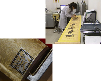 記者百般努力之下,終于在北京找到了一家權威的檢測機構,譜尼測試是一家專業的測試機構,不僅具備中國合格評定國家認可委員會CNAS及CMA資質,同時他們的檢測報告也得到美國、英國、德國等58個國家和地區相互認可,為了準確測量這幅純金畫卷的含金量,檢測人員首先剝開了裝裱的布,測出純金畫卷的面積為5837.66平方厘米。