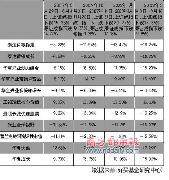 3月份以來,受到股市拖累的股票型基金,凈值下跌最少的也有10%,最多損失超過24%.然而同樣是凈值縮水,今年以來績優(yōu)與績差基金之間的差距居然高達30%,尋找抗跌的基金已經成為今年基金投資的一個主要命題。好買基金研究中心樂嘉慶指出,從去年5月底至今,股市共經歷了4個跌幅超過15%的階段。在4個階段中比較抗跌的基金表現(xiàn)出兩大特點,一是行業(yè)投資比較均衡的基金,另一個則是規(guī)模適中,倉位調整迅速的基金。