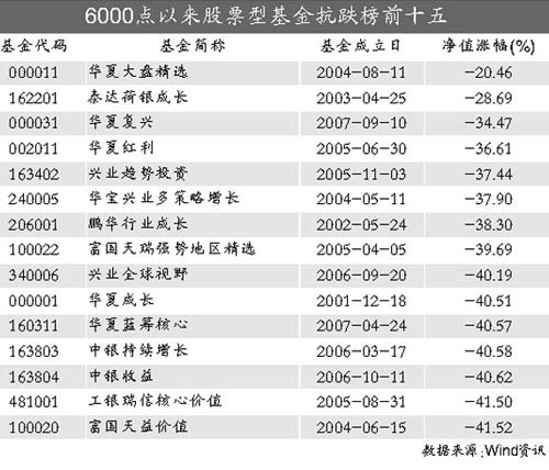從6100多點(diǎn)以來(lái),上證指數(shù)的跌幅已超過(guò)了65%。而華夏紅利等4只基金的凈值損失不到其一半。華夏大盤(pán)的凈值損失只有20%左右。興業(yè)趨勢(shì)、華寶多策略增長(zhǎng)等基金凈值也損失了不到40%。相反,部分基金在熊市的跌幅甚至超過(guò)了60%。