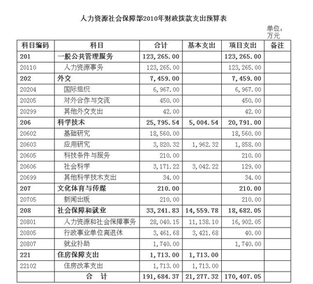 據人社部網站消息顯示,根據《財政部關于批復人力資源和社會保障部2010年部門預算的通知》(財預[2010]205號),人社部2010年預算情況如下: