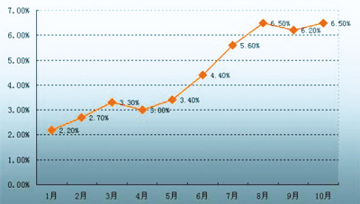 財(cái)經(jīng)評(píng)論員葉檀認(rèn)為,央行暫不加息可能來(lái)自兩個(gè)考量,一是決策層判斷目前國(guó)內(nèi)通脹壓力并不大,另一個(gè)則是隨后更加變通的匯率政策能夠緩解國(guó)內(nèi)的通脹壓力。9月份的CPI上升6.2%,10月份則上升到6.5%,這和8月份CPI增幅創(chuàng)下的逾10年最高點(diǎn)持平。盡管各月的通貨膨脹率有所波動(dòng),但大多數(shù)經(jīng)濟(jì)學(xué)家預(yù)計(jì)今年全年的通脹率會(huì)在4.5%左右。也因?yàn)檫@樣,有學(xué)者估計(jì)來(lái)年央行可能調(diào)高CPI的目標(biāo)值,將其上調(diào)至4%甚至5%。