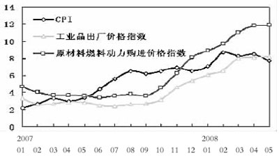 當(dāng)前經(jīng)濟(jì)生活中面臨的主要問題有:通貨膨脹壓力較大,煤電油運(yùn)供應(yīng)趨緊,農(nóng)業(yè)增長(zhǎng)基礎(chǔ)尚不牢固,金融機(jī)構(gòu)的流動(dòng)性過剩,資產(chǎn)價(jià)格特別是股市價(jià)格波動(dòng)較大,節(jié)能減排形勢(shì)嚴(yán)峻等。其中,最為突出的問題是通貨膨脹壓力較大。今年2月至4月,我國(guó)居民消費(fèi)價(jià)格指數(shù)(CPI)連續(xù)3個(gè)月漲幅超過8%,5月份CPI同比上漲7.7%,環(huán)比下降0.4%,其主要原因是蔬菜水果的產(chǎn)銷逐漸進(jìn)入旺季,帶動(dòng)食品價(jià)格漲幅有所回落。但今年下半年CPI仍將面臨較大的上漲壓力,主要表現(xiàn)在如下幾個(gè)方面: