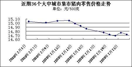 中新網2月25日電 國家發改委網站消息稱,據國家發展改革委價格監測中心監測,上周(2008.2.18-2008.2.22,下同)全國36個大中城市集市豬肉(精瘦肉)平均零售價格每500克為14.73元,比前一周(2008.2.12-2008.2.15,下同)下降1.54%。