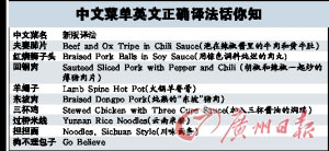 “粵菜早就走出了國門,很多都有固定的譯法。”胡總監(jiān)說,“《中文菜單英文譯法》是滯后于現(xiàn)實的,我們早就自我規(guī)范過了。”他說,由于粵菜與香港菜系一脈相承,很多粵菜早有習(xí)慣的英文譯法,一般不會出現(xiàn)不規(guī)范的情況,如燒鵝譯為“RoastedGoose”,過橋響螺片譯為“Conchinhotsoup”,鹵水拼盤譯為“Pot-stewedMeat”。