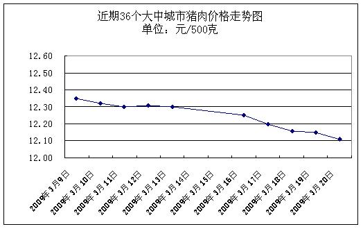 中新網3月23日電 據國家發展改革委價格監測中心監測,本周(2009.3.16-2009.3.20,下同)36個大中城市集市、超市豬肉(精瘦肉)平均零售價格每500克為12.17元,與前一周(2009.3.9-2009.3.13,下同)相比下降1.22%。