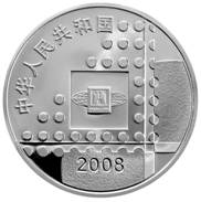 該枚銀質紀念幣正面圖案為象征錢幣的點和裝飾線與北京國際郵票錢幣博覽會會標組合設計圖,并刊國名、年號。