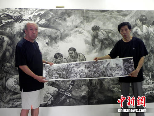 中新網唐山7月28日電(記者 白云水)28日,平均年齡已達68歲的四名唐山大地震幸存者,以他們集體創作的近百米巨幅水墨畫長卷《唐山大地震祭》,在紀念唐山大地震34周年之際獻給世人。