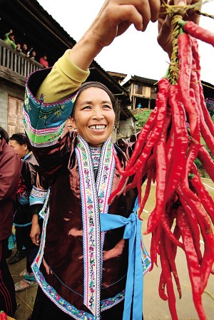 這一天,花孖村三個屯的苗家婦女,都帶著自家種植的辣椒,到村小學的操場參加花孖村辣椒擂臺賽。一年一度的辣椒擂臺賽,是花孖村婦女們的盛會,她們幾乎人人都穿上過節時才穿的傳統服裝,從遠遠近近的吊腳樓里提著一籃籃紅紅的、長長的辣椒來參賽。