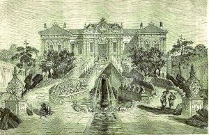 建筑物前面有十個窗口,與閣樓一起在前面排列,兩座建筑物的兩端也向前突出。這三個部分的大門是用壁柱裝飾的,分列在前門的兩邊。門順著兩邊的樓梯一直延伸到庭院和花園。每一個樓梯的兩側都有噴泉,沿著噴泉的輪廓還擺滿了盛滿花的花瓶。這些樓梯邊的噴泉和凡爾賽宮的圣云起到了同樣的效果,只是這里的噴泉池壁上刻著部分龍的圖畫。三角形的水池兩側排列著12種動物,都是不一樣的屬相,每排六個,中國人叫十二生肖神。人們可以根據這些動物來判斷時間,因為在每一天的每一小時,以及一年四季里,這些動物在水池中的倒影都是不一樣的。