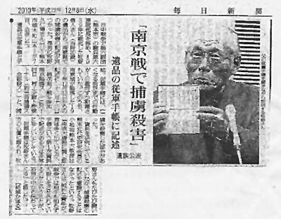12月8日出版的日本《每日新聞》,以《“攻打南京的時候曾經殺害過俘虜”——一名日軍士兵從軍日記中的記述》為題,刊登了記者結城薫的一篇消息,并附上了說明為“牧野久仁博正在介紹父親的從軍手記”的照片。