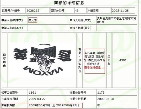 于是,莫元忠于2005年11月28日注冊了“莫言”餐廳類商標,掛起了“莫言餃子館”的牌子。記者在中國商標網查到,2009年3月27日,“莫言”餐廳類商標初審公示,同年6月28日正式注冊成功,專用權期限一直到2019年6月28日。