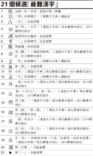 中新網10月22日電 身為中國人,就應該懂中文字,你又認得幾多個?據香港明報報道,有網民在網上搞“最難漢字”評選活動,選出21個一般人不認識的生字候選,個個令人摸不著頭腦。