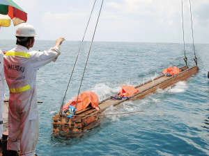 據介紹,在能見度幾乎為零的31米水深處進行“海底穿梁”,史無前例,難度相當大。交通部廣州打撈局克服海底含沙泥層阻力大和作業現場浪涌大等種種困難,不斷創新工藝,優化工序,用了2016班次水,順利、安全地穿過36根底托梁。