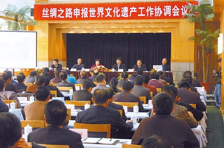 12月28日上午9時,絲綢之路申報世界文化遺產工作協調會議在蘭州飯店8樓會議室召開,國家文物局局長單霽翔、甘肅省副省長咸輝、國家文物局文物保護司司長顧玉才及79名相關省區代表參加了當天的會議。會上,單霽翔向與會代表強調了絲路申遺的重大意義,并指出了全國48個申遺點存在的問題和不足。