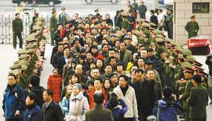 昨日,軍博工作人員列隊歡迎前來參觀的市民。昨日是軍博免費對社會開放的第一天,其也是國家有關部門1月23日聯合下發《關于全國博物館、紀念館免費開放的通知》后,北京地區第一家向觀眾敞開大門的國家級博物館。截至昨日16時30分,共有12555人參觀軍博,該數字比上周的日均1250人增加了9倍。記者 浦峰 攝