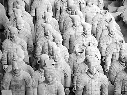 我們下面來看一些具體的藝術品。雕塑我選擇的是秦俑。這些秦俑是陪著秦始皇轉入地下,進入歷史的,本來不會再出來了,可是,秦始皇自己絕對沒有想到,他帶入地下的這么多兵馬,過了兩千多年,忽然到地面上來了,而且還很出風頭,不但在中國,而且在世界各地的博物館露面。這是古人絕對不能想象得到的。同時,我去參觀的時候,看到秦俑很感動,這些都是陜西人的祖先。陜西人的祖先,他們開口講話我可能不懂,第一他是陜西腔,第二他是二千年前的說話方式,聽他們說話可能今天的聽眾都要嚇一跳。說起話來,他說他的咸陽,我說我的西安,我說西安事變他也不知道是誰在變。再說他們的兵馬再強盛,用最強的弩箭來射,也絕對射不進桃花源,射不到那個漁人的身邊。我講的是一種感慨,一種懷古,而且包含一種詮釋。