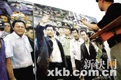 昨日,記者在作畫現場看到很多熟悉的畫面,有《敬禮娃娃》、《握筆的手》……而在《地劫·重生》長卷上還驚喜地發現,有一組創作正是取材于本報特派四川記者李潔軍、王小明的一幅攝影作品,該新聞圖片攝于5月16日上午,畫面凝固的是當時胡錦濤總書記來到四川地震災區北川羌族自治縣,向當地群眾和搶險武警官兵揮手慰問的瞬間。 (記者 陳琦鈿 實習生 李淑子)