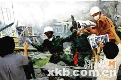 “而我認為,這次是賑災作畫,大家應該用愛心去畫,而不是去強調每個人的繪畫個性。只要你愿意做,藝術風格是可以磨合的,當然這需要一股非常強大的推動力去促使大家這么做……”陳鏗用了整整一個晚上,把1千多張發自災區的圖片報道翻了個遍,之后從中選擇出幾十張非常具有代表意義的“瞬間”,重新組合成三組震撼人心的畫面,《地劫》、《拯救》、《重生》。