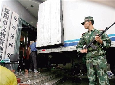 昨天,在荷槍實彈的武警押運下,包括漢代說唱俑、搖錢樹等國寶在內的6091件文物從綿陽博物館緊急轉移到廣漢三星堆遺址博物館庫房存放。因擔心唐家山堰塞湖可能潰壩導致洪水毀壞文物,綿陽博物館決定緊急轉移2.5萬件文物,當天轉移了第一批。