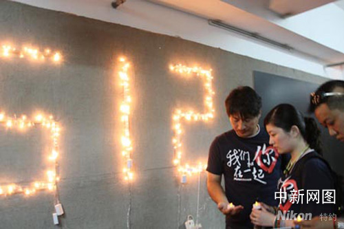 中新網南京六月十三日電 (牛莉) 六月十二日下午兩點二十八分,一群南京市民在南京先鋒書店,自發站成一排,手里拿著蠟燭,表情嚴肅,低頭默哀,他們的前方赫然醒目的亮著5.12這個銘記在人們心中的數字。