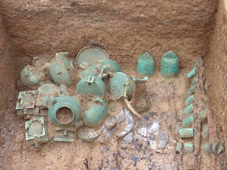 負責此次考古發掘的南陽市文物考古研究所專家柴中慶介紹,經文物鉆探發現,該片古墓葬有31座,年代大約為春秋晚期,其中大多數為土坑墓,1號墓和2號墓正在發掘清理。目前已出土銅鼎、銅缶、銅簠和青銅編鐘以及大量皮甲、金箔、銅飾件等珍貴文物。其中一號墓出土的銅鈕鐘、銅镈鐘、石編磬在南陽城區還是第一次發現;出土的5件銅鼎,其中兩件器形較大,直徑為50厘米,這是南陽城區發現的最大銅鼎。此次發現古墓葬之多,出土的銅鼎形狀之巨,古墓葬規格之高,在南陽市考古發掘史上尚屬首次。