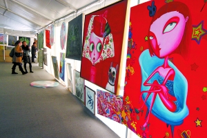 4000平方米的臨建大棚里,1700多幅當代藝術品一個挨一個掛著。門口,一塊從字體到用色都不那么陽春白雪的牌子上寫著“宋莊藝術集市”。“今年90%作品的標價只相當于去年的一半。”集市負責人王經理說。
