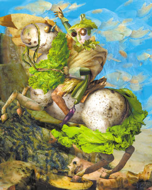 桔多淇在產(chǎn)生蔬菜作畫的想法后,就開(kāi)始轉(zhuǎn)悠北京的菜市場(chǎng)。她去買菜,看到長(zhǎng)相怪異的生姜,眼里就會(huì)大放異光,迅速下手,而走到賣豆腐的面前,也不說(shuō)話,拿出相機(jī)就對(duì)著白花花的豆腐開(kāi)拍。桔多淇說(shuō):“菜販以為是媒體搞衛(wèi)生監(jiān)督,嚇得不行,其實(shí)只是因?yàn)槲易觥蹲詈蟮耐聿汀返淖雷有枰艽笠粔K豆腐,我買回家也吃不完,于是就在菜市場(chǎng)拍了回家用電腦處理合成。”桔多淇說(shuō),她尋找原料的菜市場(chǎng)幾乎每一個(gè)菜攤她都“光顧”過(guò),并且對(duì)菜市場(chǎng)邊角余料情有獨(dú)鐘,甚至還會(huì)四處“撿”菜。