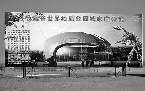 在諸城市政府網站上,關于最新的招商引資項目中,就有兩個關于建設恐龍化石地質公園的項目。在臧家莊發掘現場,一個蛋殼形狀的場館規劃圖屹立在發掘現場。工作人員介紹說,自2008年以來,先后在此出土大量恐龍化石,該化石群規模之大、品種之多世界罕見,是古生物科考的重大發現。為保護好該化石群,諸城市決定在此建設恐龍谷世界地質公園分館。該館外形設計為裂開的恐龍蛋殼形狀,寓意新發現、新收獲、新希望。館內展示主要采取底層立體展示、化石平面展覽、 地下化石層隧道展示等,項目占地約100畝,建筑面積3500平方米,總投資2000多萬元,于2008年9月開工建設,計劃2009年7月1日前建設并投入運營。分館建成后,與恐龍谷世界地質公園主場館遙相呼應,形成“一龍一蛋” 的旅游格局。“建成之后大家就可以順著扶梯到地下,看看發掘現場,看看恐龍化石,這些在不遠的將來都會實現。”工作人員告訴記者。工作人員所說的主場館,就是即將建立在這次發掘出最大鴨嘴龍化石的庫溝村村北。在這條東西走向的化石隆起帶上,將建成一座全新的恐龍化石地質公園。“ 這里發掘的恐龍化石,顏色還真挺特別,紅色、褐色的特別多,可能與這里的土質有關吧!周圍都是紅土。 而在臧家莊那邊,發掘的化石顏色大都是黑色或者白色。”
