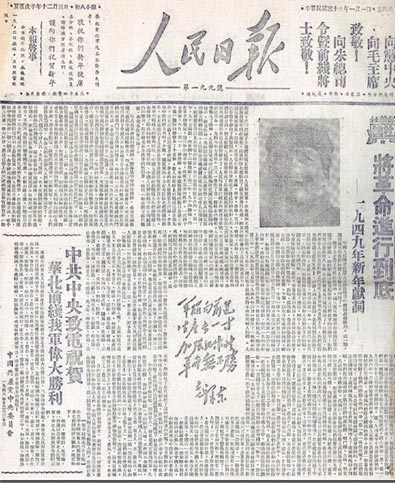 3.1949年1月1日《人民日報》第1版刊登的新華社社論《將革命進行到底 ——一九四九年新年獻詞》