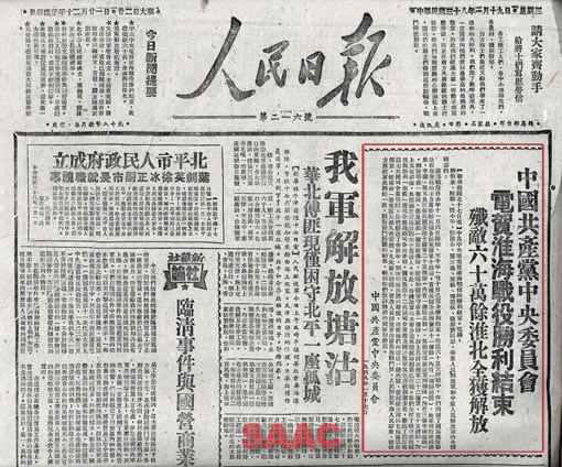 5.1949年1月19日,《人民日報》刊登的中共中央對淮海戰役勝利結束的賀電