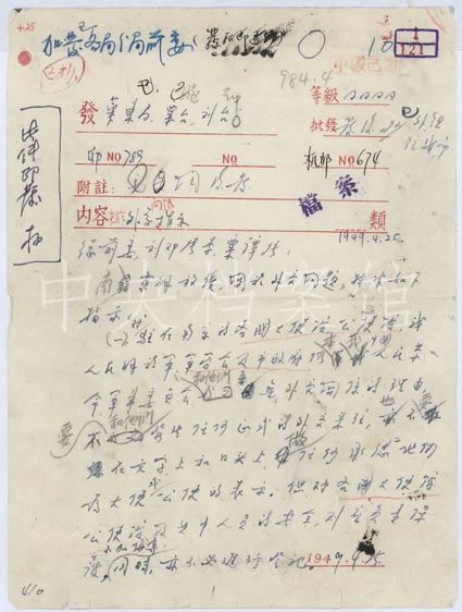 隨著一些大城市的陸續解放,中國共產黨在外事方面遇到的問題越來越多,外交問題變得更加現實和敏感。1949年1月19日,毛澤東審閱修改并簽發了中央關于外交工作的指示,指示對外交關系、外資關系、對外貿易、海關稅收、外國人辦的報紙刊物通訊社及外國記者等方面的重要問題,都規定了暫行的政策。