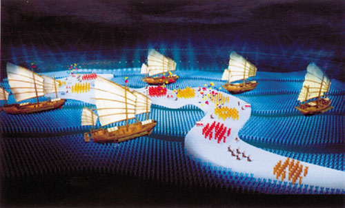 就這樣,一個可能是啟發了后來北京奧運開幕式中的“卷軸畫卷”的創意就此誕生。“卷軸畫”可謂廣東創意的“縮小版”,廣東的想法是整個場館的地面都成為屏幕。而“卷軸畫”則是長147米、寬27米的LED屏幕。